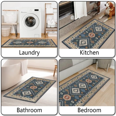 FURNIinspire Floor Mats Home 3 Piece Kitchen Rug Machine Washable Floor Mat For Living Room, Vintage Carpet, Non Slip, Dark Blue, 60″*20″