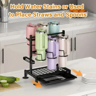 FURNIinspire 6-slot cup organizer blends sturdiness and versatility—crafted from thickened reinforced carbon steel with a rust-resistant baked enamel finish, it holds up to six thermos cups, 40oz tumblers, or mugs. Adjustable slots fit various sizes, while a drain tray catches excess water for dry storage. It saves cabinet space, doubles as a mug display, and works on countertops. Easy to carry and clean, its sleek design makes it a practical kitchen essential and ideal gift for cup collectors.